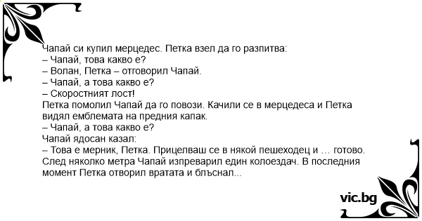 – Чапай, мерникът ти нещо не работи – ако не бях аз, този щяхме да го пропуснем…