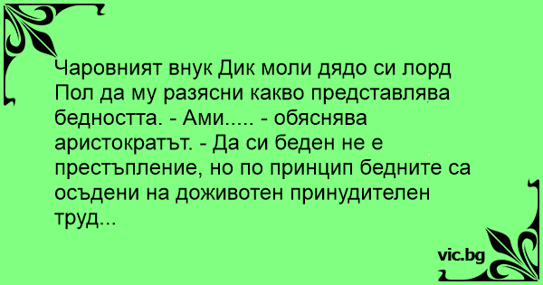 Чаровният внук Дик моли дядо си лорд Пол да му разясни какво представлява бедността. - Ами..... - обяснява аристократът. - Да си беден не е престъпление, но по принцип бедните са осъдени на доживотен принудителен труд...