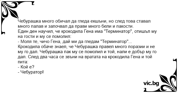 Един ден научил, че крокодила Гена има "Терминатор", отишъл му на гости и му се помолил:
