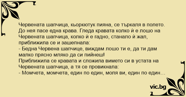 Червената шапчица, кьоркютук пияна, се търкаля в полето. До нея пасе една крава. Гледа кравата колко ѝ е лошо на Червената шапчица, колко ѝ е гадно, станало ѝ жал, приближила се и зашепнала:
