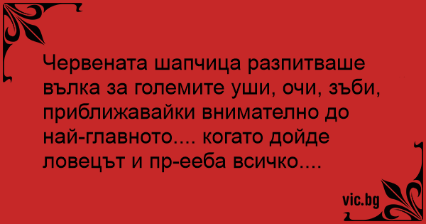 Червената шапчица разпитваше вълка за големите уши, очи, зъби, приближавайки внимателно до най-главното.... когато дойде ловецът и пр-ееба всичко....