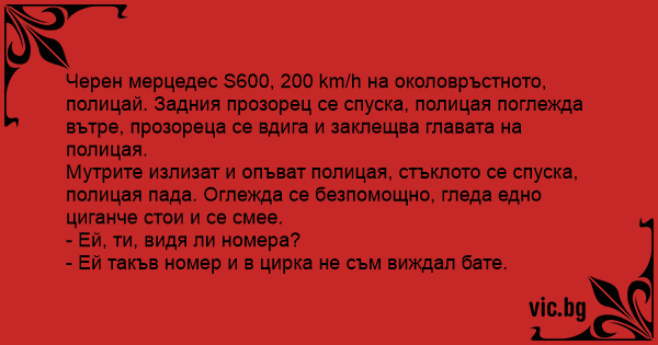 Черен мерцедес S600, 200 km/h на околовръстното, полицай. Задния прозорец се спуска, полицая поглежда вътре, прозореца се вдига и заклещва главата на полицая.