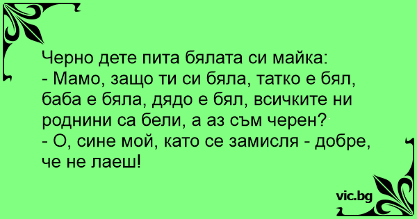 - Мамо, защо ти си бяла, татко е бял, баба е бяла, дядо е бял, всичките ни роднини са бели, а аз съм черен?