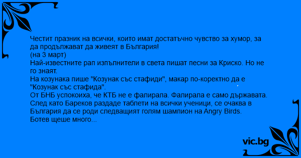 Честит празник на всички, които имат достатъчно чувство за хумор, за да продължават да живеят в България!