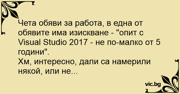 Чета обяви за работа, в една от обявите има изискване - "опит с Visual Studio 2017 - не по-малко от 5 години".