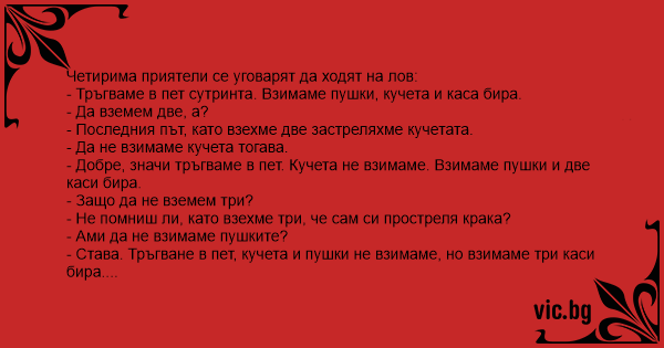- Добре, значи тръгваме в пет. Кучета не взимаме. Взимаме пушки и две каси бира.