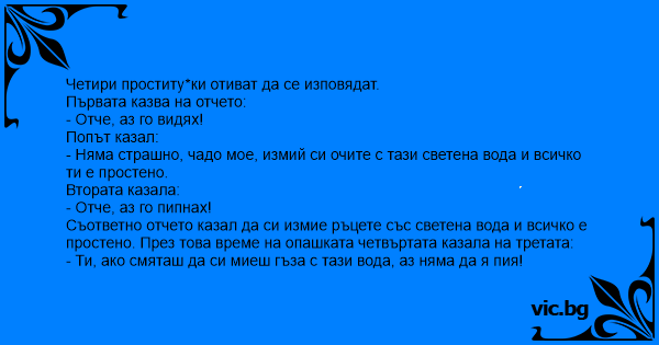 Съответно отчето казал да си измие ръцете със светена вода и всичко е простено. През това време на опашката четвъртата казала на третата: