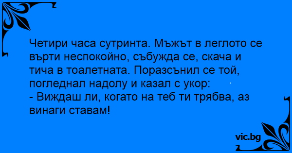 Четири часа сутринта. Мъжът в леглото се върти неспокойно, събужда се, скача и тича в тоалетната. Поразсънил се той, погледнал надолу и казал с укор: