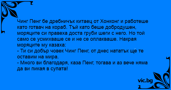 - Много ви благодаря, каза Пенг, тогава и аз вече няма да ви пикая в супата!