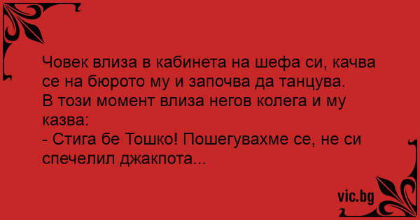 Човек влиза в кабинета на шефа си, качва се на бюрото му и започва да танцува.