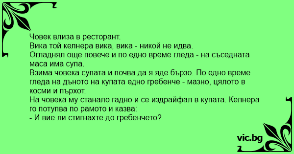 Взима човека супата и почва да я яде бързо. По едно време гледа на дъното на купата едно гребенче - мазно, цялото в косми и пърхот.