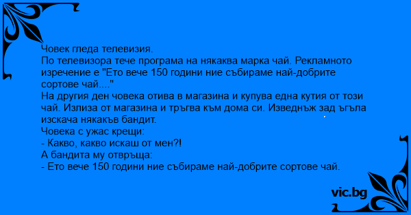 По телевизора тече програма на някаква марка чай. Рекламното изречение е "Ето вече 150 години ние събираме най-добрите сортове чай...."