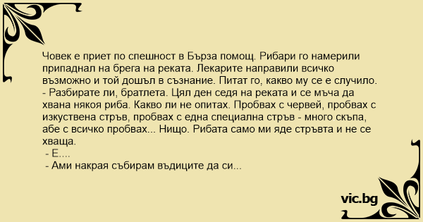 Човек е приет по спешност в Бърза помощ. Рибари го намерили припаднал на брега на реката. Лекарите направили всичко възможно и той дошъл в съзнание. Питат го, какво му се е случило.