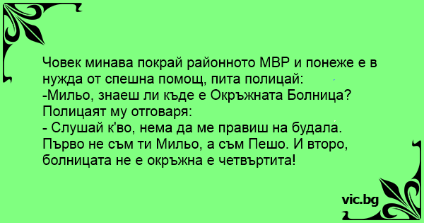 Първо не съм ти Мильо, а съм Пешо. И второ, болницата не е окръжна е четвъртита!