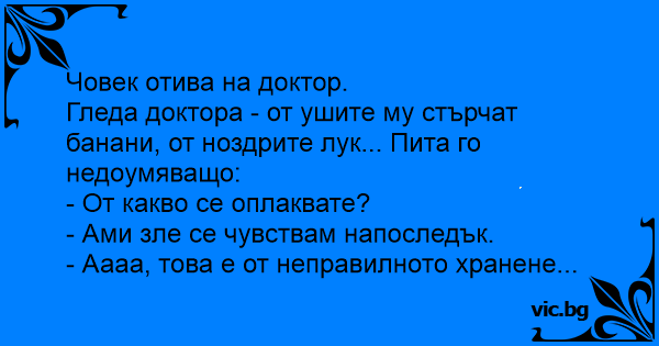 Гледа доктора - от ушите му стърчат банани, от ноздрите лук... Пита го недоумяващо: