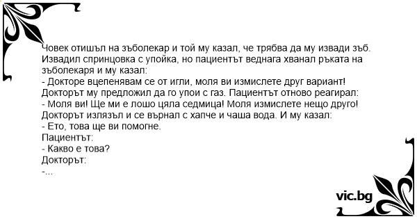 Човек отишъл на зъболекар и той му казал, че трябва да му извади зъб. Извадил спринцовка с упойка, но пациентът веднага хванал ръката на зъболекаря и му казал: