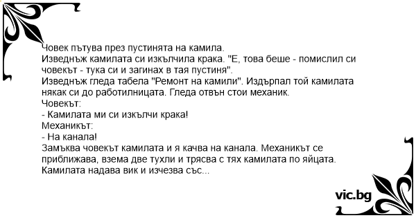 Изведнъж гледа табела "Ремонт на камили". Издърпал той камилата някак си до работилницата. Гледа отвън стои механик.