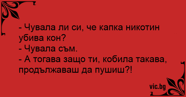 - А тогава защо ти, кобила такава, продължаваш да пушиш?!