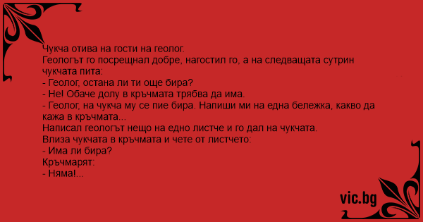 - Геолог, на чукча му се пие бира. Напиши ми на една бележка, какво да кажа в кръчмата...