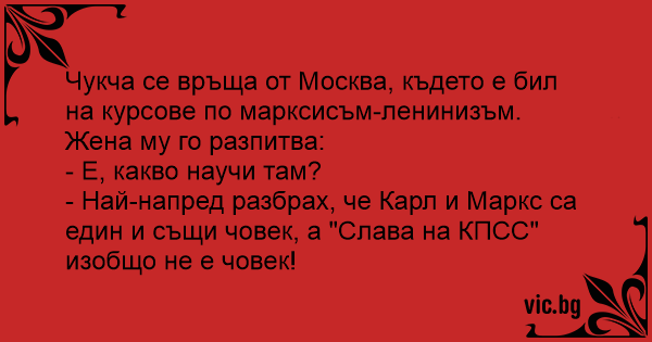 - Най-напред разбрах, че Карл и Маркс са един и същи човек, а "Слава на КПСС" изобщо не е човек!