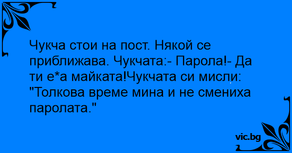 Чукча стои на пост. Някой се приближава. Чyкчата:- Паpола!- Да ти eбa майката!Чyкчата си мисли: