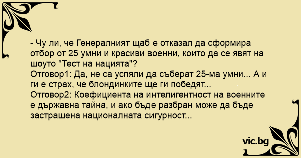 - Чу ли, че Генералният щаб е отказал да сформира отбор от 25 умни и красиви военни, които да се явят на шоуто "Тест на нацията"?