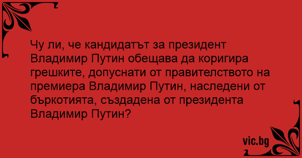 Чу ли, че кандидатът за президент Владимир Путин обещава да коригира грешките, допуснати от правителството на премиера Владимир Путин, наследени от бъркотията, създадена от президента Владимир Путин?