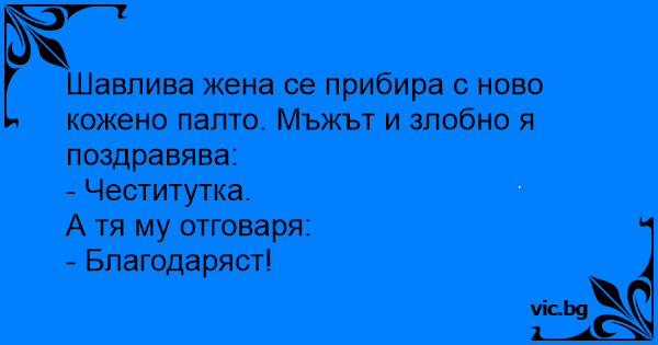 Шавлива жена се прибира с ново кожено палто. Мъжът и злобно я поздравява: