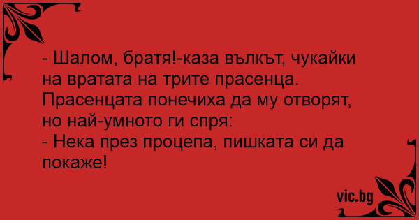 - Шалом, братя!-каза вълкът, чукайки на вратата на трите прасенца.