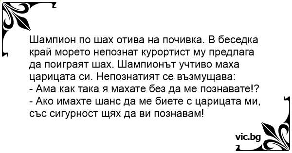 Шампион по шах отива на почивка. В беседка край морето непознат курортист му предлага да поиграят шах. Шампионът учтиво маха царицата си. Непознатият се възмущава: