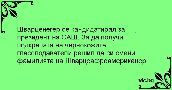 Шварценегер се кандидатирал за президент на САЩ. За да получи подкрепата на чернокожите гласоподаватели решил да си смени фамилията на Шварцеафроамериканер.