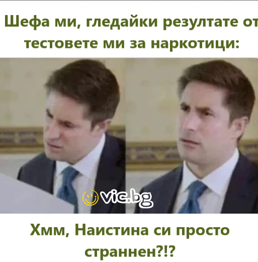 Шефа ми, гледайки резултате о тестовете ми за наркотици: Хмм, Наистина си просто страннен?!?