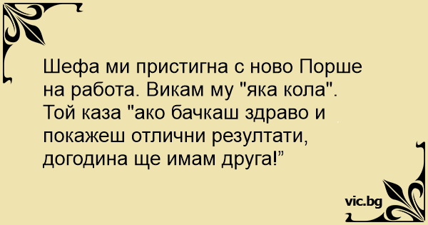 Директоре, многу убав Мерцедес сте купиле! - Ааа фала. Ако работиш и натаму напорно како до сега, догодина и на жена ми ке и' купам ваков.