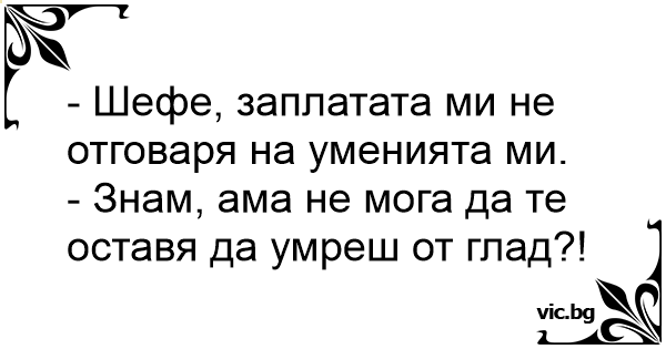 - Jo, chefen, jag tycker inte att min lön stämmer överens med de kunskaper jag har. - Nej, men vi kan ju inte låta dig svälta ihjäl.