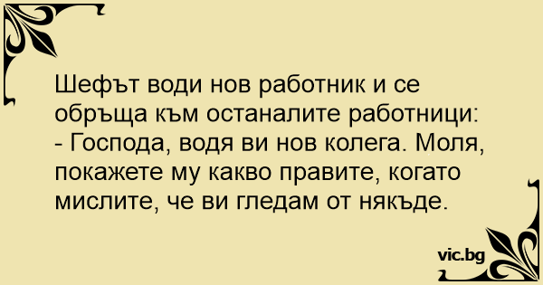- Господа, водя ви нов колега. Моля, покажете му какво правите, когато мислите, че ви гледам от някъде.