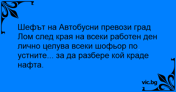 Шефът на Автобусни превози град Лом след края на всеки работен ден лично целува всеки шофьор по устните... за да разбере кой краде нафта.