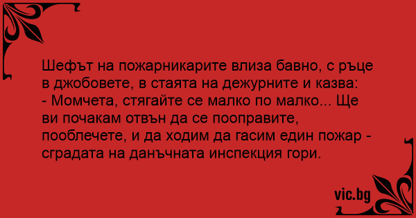 - Момчета, стягайте се малко по малко... Ще ви почакам отвън да се пооправите, пооблечете, и да ходим да гасим един пожар - сградата на данъчната инспекция гори.