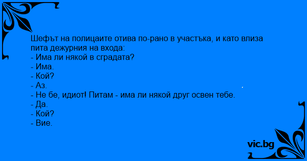 Шефът на полицаите отива по-рано в участъка, и като влиза пита дежурния на входа:
