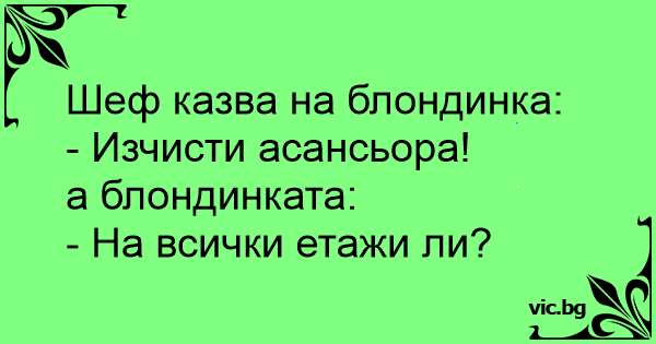 - Szef w pracy zwraca się do Blondynki - To jeszcze Pani tylko w windzie posprząta i może Pani iść do domu - Tak. Dobrze szefie!... ale na każdym piętrze ?!