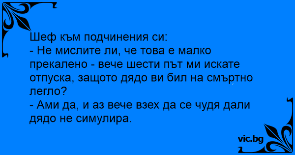 - Не мислите ли, че това е малко прекалено - вече шести път ми искате отпуска, защото дядо ви бил на смъртно легло?