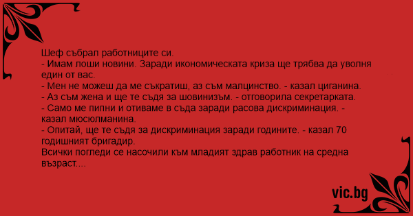 - Имам лоши новини. Заради икономическата криза ще трябва да уволня един от вас.