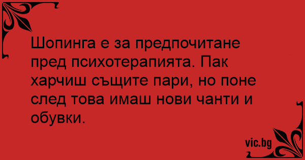 Шопинга е за предпочитане пред психотерапията. Пак харчиш същите пари, но поне след това имаш нови чанти и обувки.