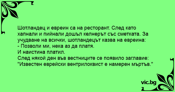 Шотландец и евреин са на ресторант. След като хапнали и пийнали дошъл келнерът със сметката. За учудване на всички, шотландецът казва на евреина:
