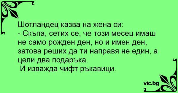- Скъпа, сетих се, че този месец имаш не само рожден ден, но и имен ден, затова реших да ти направя не един, а цели два подаръка.