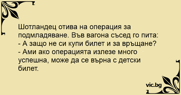 Шотландец отива на операция за подмладяване. Във вагона съсед го пита: