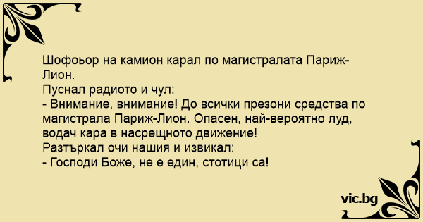 - Внимание, внимание! До всички презони средства по магистрала Париж-Лион. Опасен, най-вероятно луд, водач кара в насрещното движение!