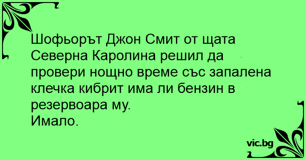 Шофьорът Джон Смит от щата Северна Каролина решил да провери нощно време със запалена клечка кибрит има ли бензин в резервоара му.