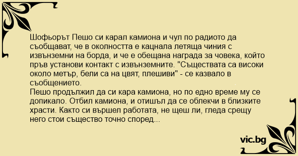 Пешо продължил да си кара камиона, но по едно време му се допикало. Отбил камиона, и отишъл да се облекчи в близките храсти. Както си вършел работата, не щеш ли, гледа срещу него стои същество точно според описанието по радиото - високо около метър, плешиво, бяло...