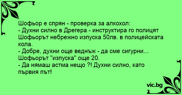 - Духни силно в Дрегера - инструктира го полицят Шофьорът небрежно изпуска 50лв. в полицейската кола.