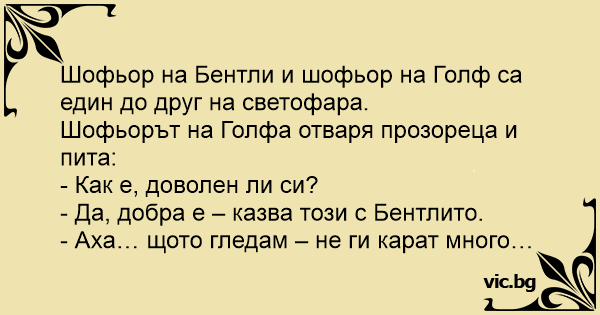 Шофьор на Бентли и шофьор на Голф са един до друг на светофара.